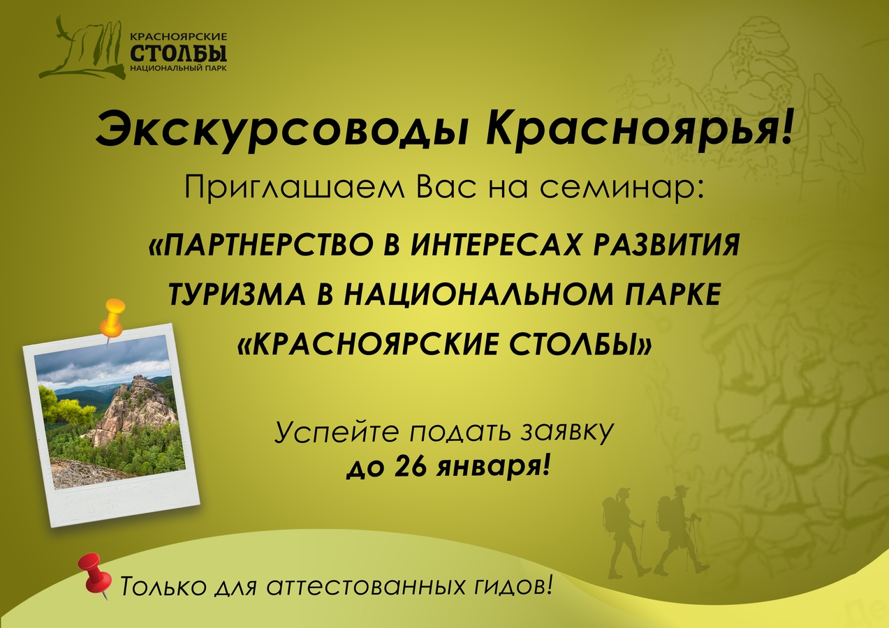 С сегодняшнего дня начинается приём заявок гидов-экскурсоводов для участия в семинаре, с последующей аккредитацией, дающей разрешение на проведение экскурсий на территории национального парка «Красноярские Столбы».