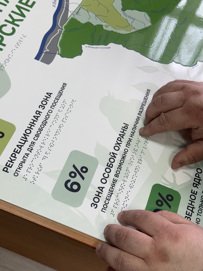 В основе пособия – реальные потребности слабовидящих и незрячих людей, которые были выявлены в процессе общения с профессиональными консультантами, взрослыми и детьми с особенностями зрения, а также опыт сотрудников нацпарка, который они приобрели в процессе работы над обновлением инклюзивной экологической тропы.
