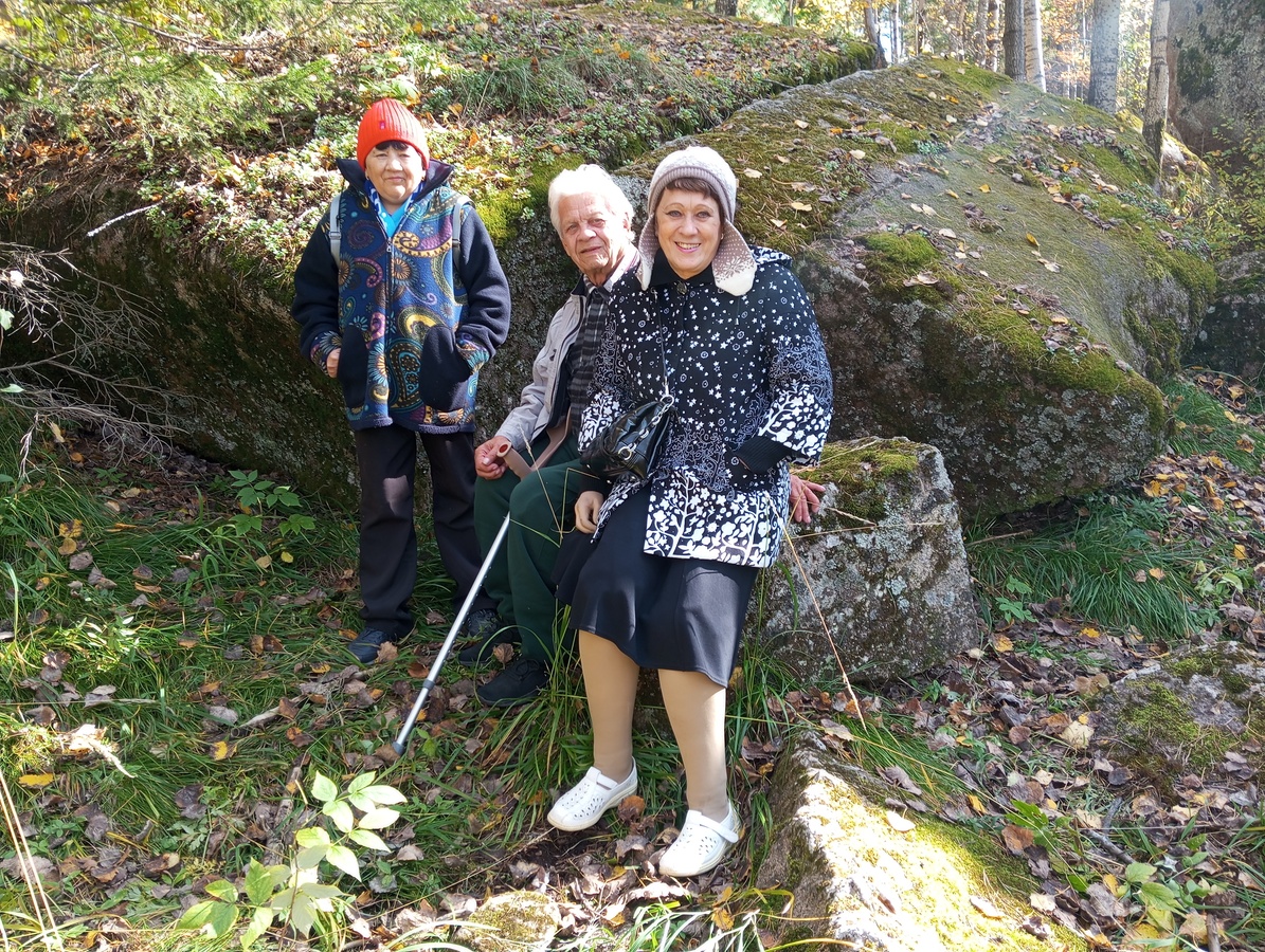Но это было только начало. Когда мы подошли к Первому Столбу, меня ожидало еще одно душевное потрясение. Сопровождающая наших «особых гостей» сотрудница пансионата Марина Анатольевна «негодовала» на «старейшего из мужчин» 92-летнего подопечного, который без разрешения увел опирающуюся на ходунки даму к скале Перья (видимо, показать, что он когда-то играючи их покорял). Оказывается, у моих экскурсантов на всех десять человек едва ли не десять собственных ног, коленок, локтей, кистей, голеностопов! Кто-то еще два месяца назад лежал с переломами рук и ног, а одна, пожалуй, самая бодрая наша героиня вообще не имеет обеих ног и одной руки. Да и вторая ее рука, скажем так, повреждена.