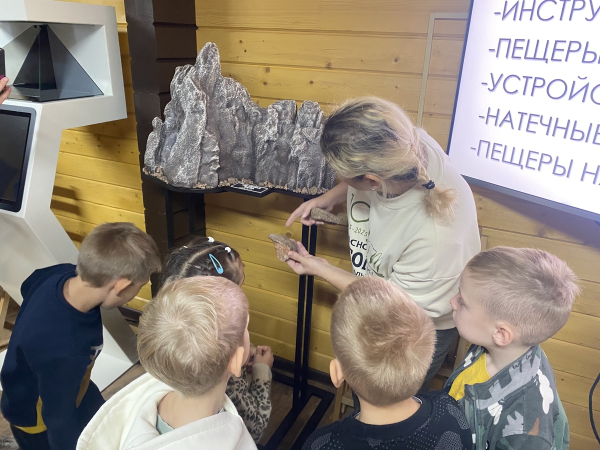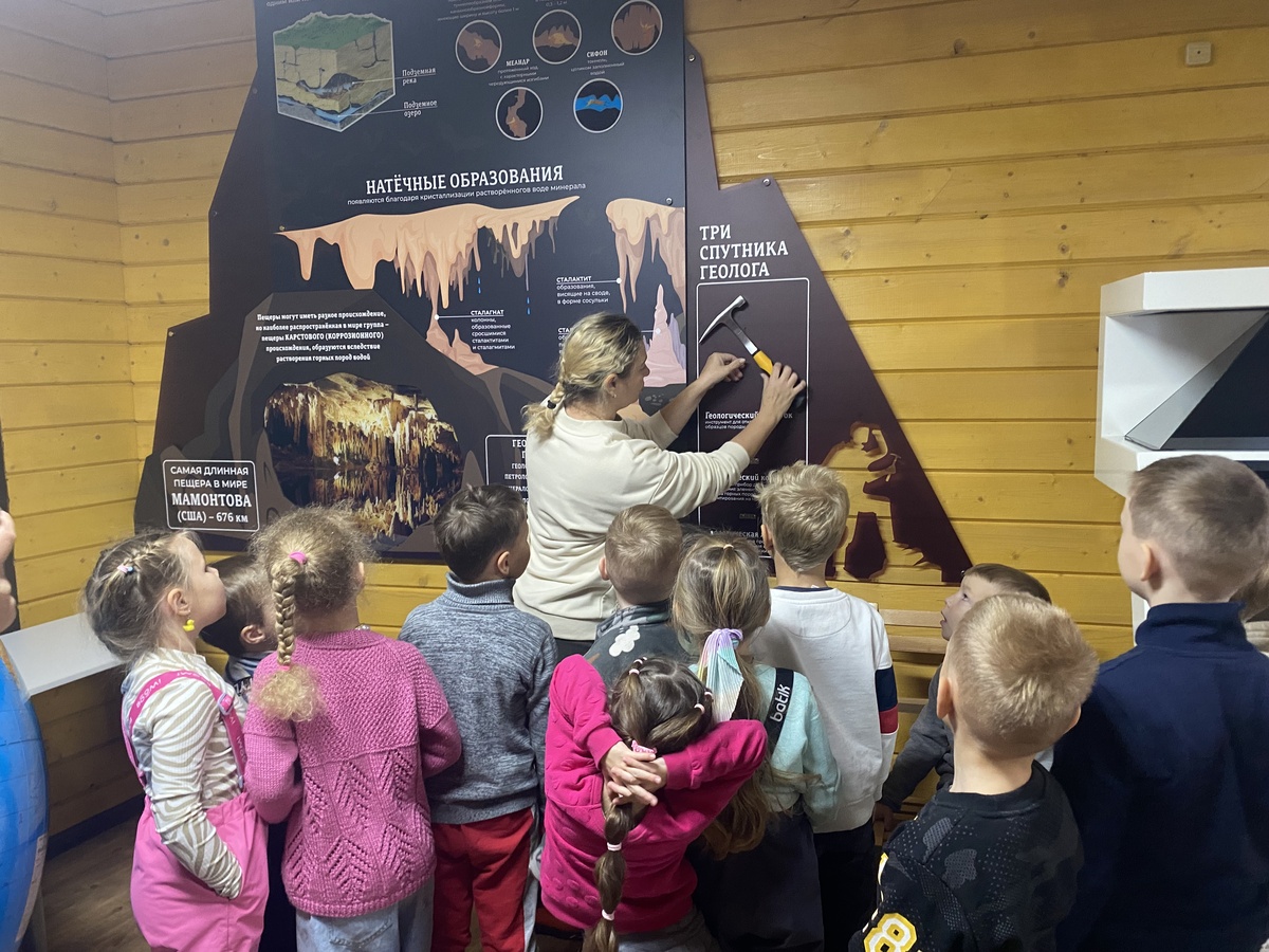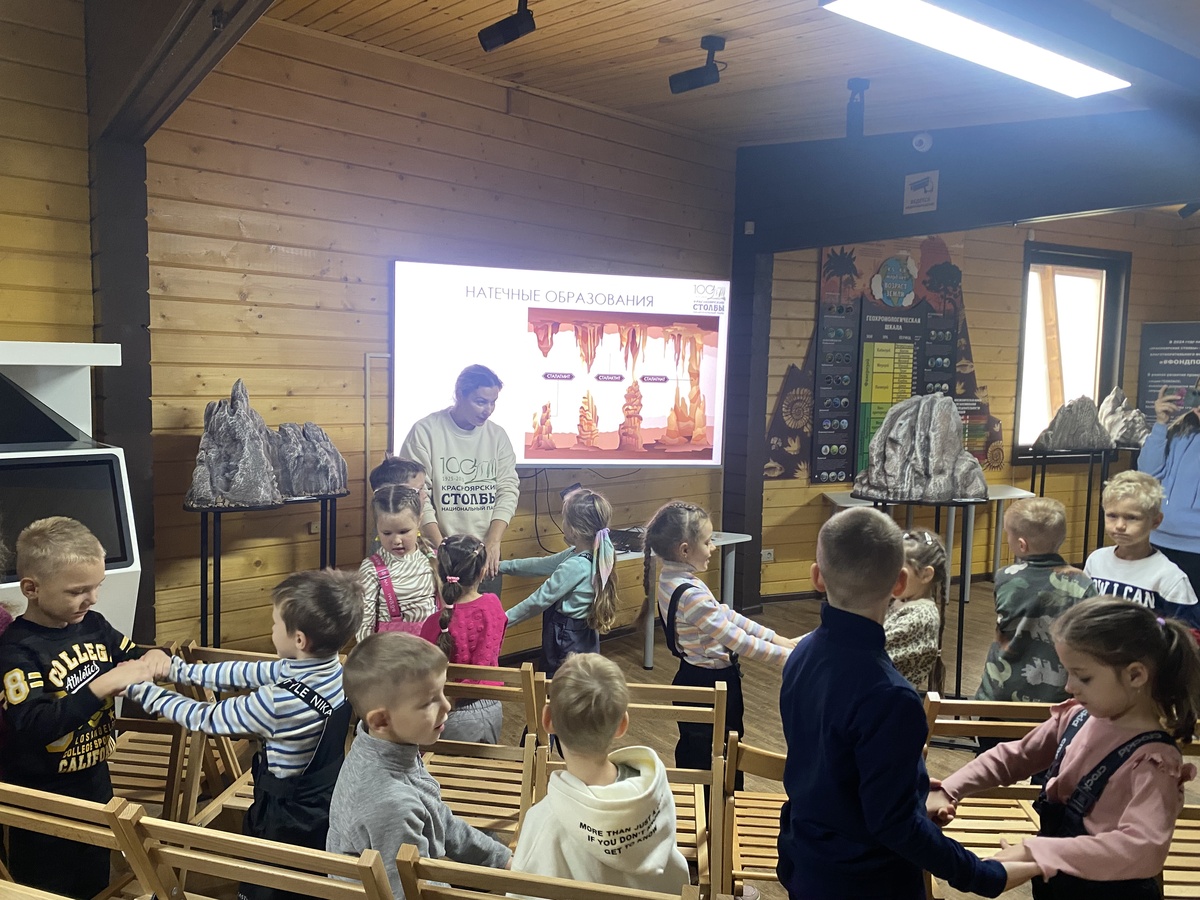 В пятницу, 3 октября, ребята подготовительной группы приехали в национальный парк еще в теплую осень. В Геоклассе дошколята познавали серьезную тему – «Геология. Подземный мир». Поговорили про пещеры, их устройство, натечные образования (сталактиты и сталагмиты), про обитателей и про исследователей. Рассмотрели макеты скал и коллекции горных пород, рассмотрели на глобусе строение нашей планеты. А после занятия прошлись с гидом до скалы Чертов палец, послушали легенды и исторические факты о скалах, реках, животных и растениях заповедной территории.