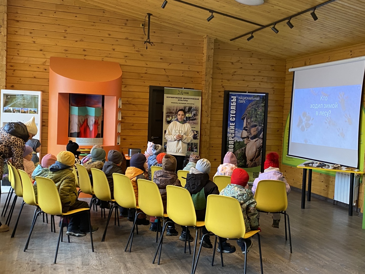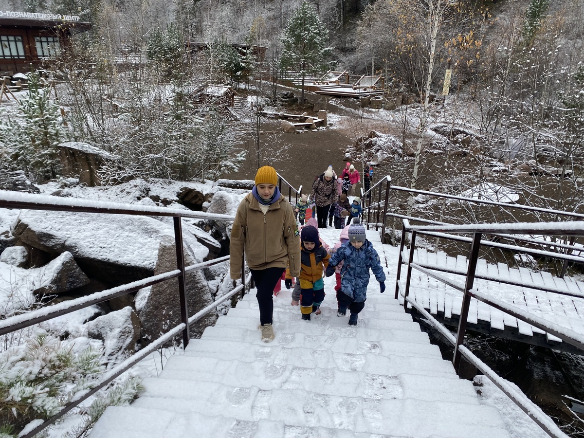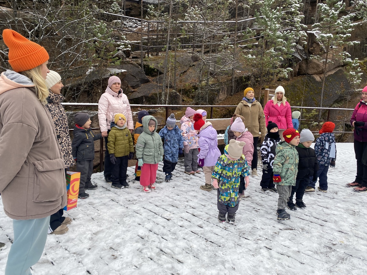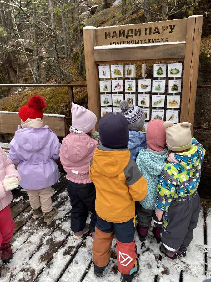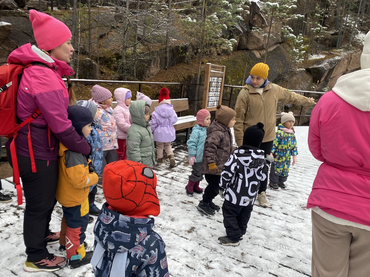 А сегодня, в понедельник, 6 октября, детей старшей группы на Восточном входе ждала уже настоящая зима. Выпавший снежок и небольшой морозец не помешали дошколятам прогуляться с экскурсоводом в Гранитном карьере и по настильной тропе маршрута «Легенды Такмака». Зато после такой прогулки на свежем воздухе так приятно посидеть в научно-познавательном центре! На занятии «Кто в лесу живет?» в доступной форме малышам рассказали о животных нацпарка и их следах.