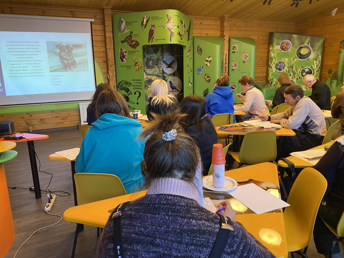 В качестве тренировки перед основным тестированием начальник отдела экопросвещения Марина Щербакова провела небольшую викторину. Победителям вручили юбилейные наборы открыток с видами нацпарка. Ну, а после разминки для участников прозвучали напутственные слова от космонавтов Международной космической станции.