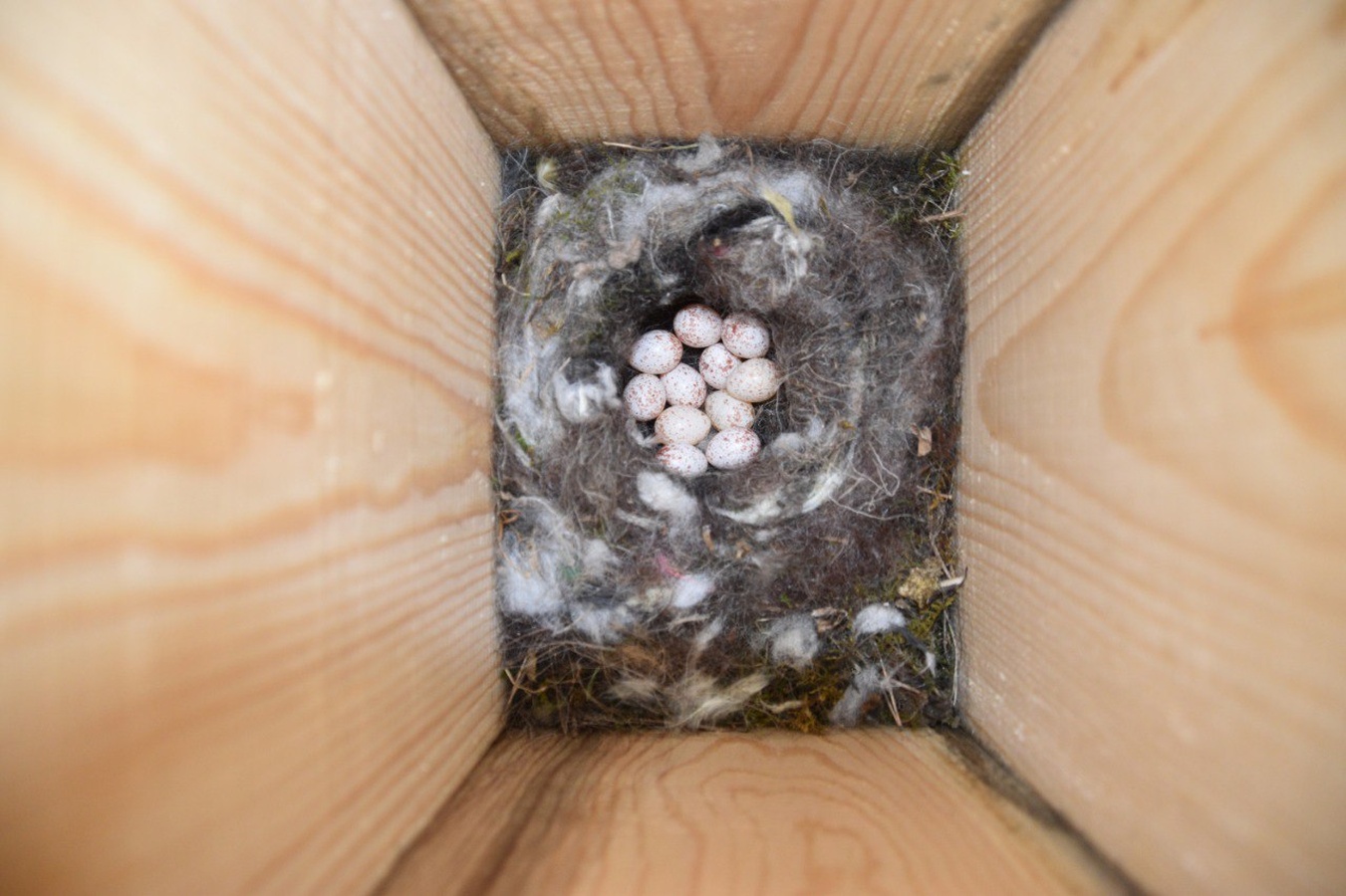«Рождение» кладки – дело непростое, и может растянуться почти до двух недель, ведь детей у больших синиц обычно от 9 до 12. Находили гнезда и с 16-18 яйцами, но в таком случае часть точно были подкидышами. Те птички, чье жилище было разорено, или занято, например, мухоловкой-пеструшкой, вынуждены искать новое место для гнездования. На его обустройство уйдет немало времени, а если яичко «просится на свет», то нужно его срочно сбросить, и лучше всего в гнездо другой синицы, тем самым дать своим детям шанс на жизнь, даже если воспитывать и будет другая мать. Ведь, как правило, охраняют кладку и птенцов синички более чем храбро! При беспокойстве синица не слетает, а напротив, начинает пугать агрессора. Учитывая различия в размерах, поступок более чем мужественный. Синица, расправив хвост, шипит, подпрыгивает, и всем видом показывает, что лучше убраться по-хорошему!