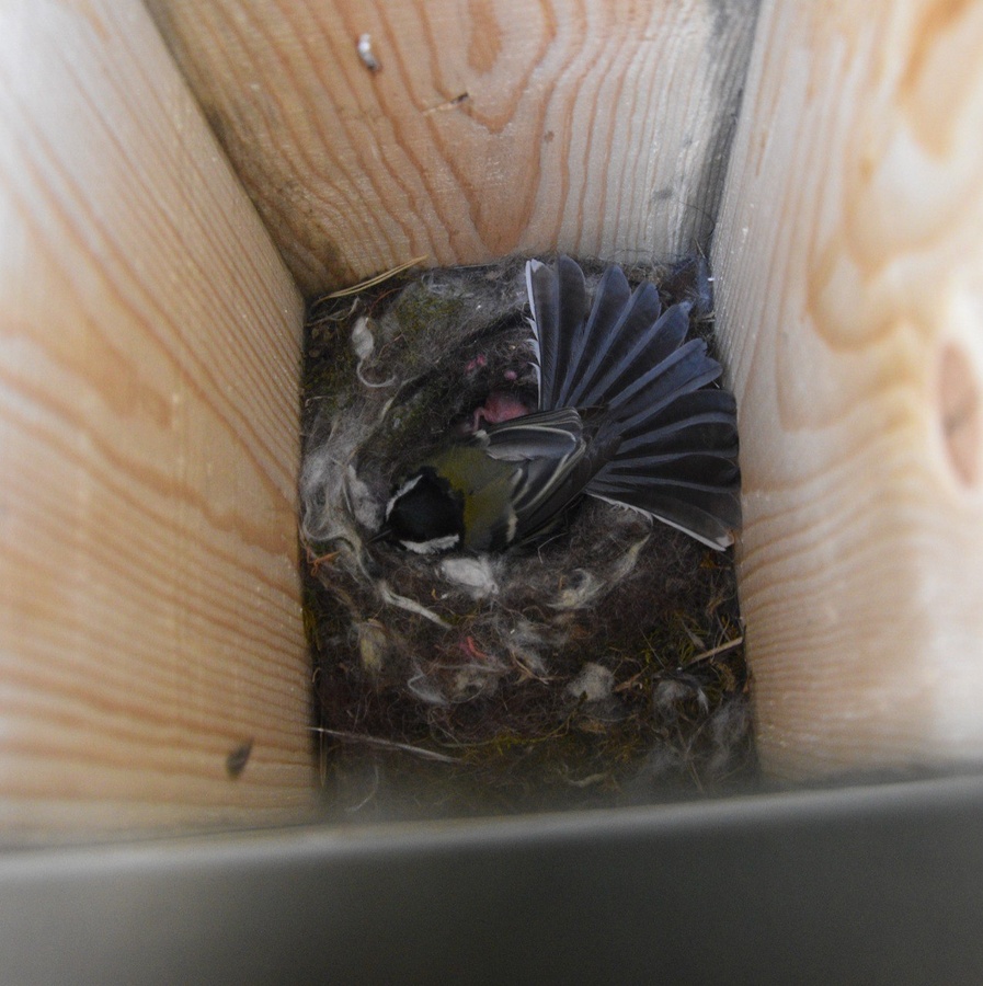 Сегодня мы показываем, как справились с этой задачей большие синицы, которые предпочитают гнездиться закрыто, в основном в дуплах. Найдя подходящее место, самец начал петь рядом, привлекая самку. Устраивать уютное гнездышко ей пришлось самой, в этом процессе самец лишь сопровождал подругу. И с этим птички справились отлично. В ход пошли не только мох, но и шерсть, в который пернатые при особо мерзкой погоде зарывались почти полностью, только глаза торчали. Это была по-настоящему сложная задача, ведь в гнезде у больших синиц до 12 яиц! Но, ловко подоткнув, словно одеяло, шерсть, птицы стойко выдержали ледяной дождь, снег и отрицательные температуры. Выкармливали молодых уже оба родителя. Все птенчики выжили, и в срок покинули уютный дом.