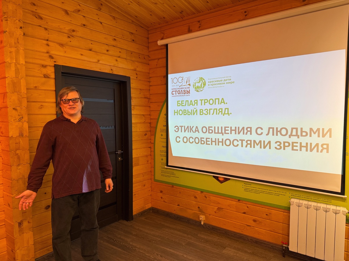Для сотрудников отдела экологического просвещения нацпарка была организована презентация от эксперта по доступной среде Красноярской краевой организации ВОС Владимира Беляева «Этика общения с людьми с особенностями зрения». В докладе Владимир рассказал про разные группы инвалидности и озвучил общие правила общения с людьми, имеющими особенности здоровья, поделился основными документами, регламентирующими права инвалидов на международном уровне и, конечно, ключевое внимание уделил взаимодействию со слабовидящими и незрячими людьми на природе.