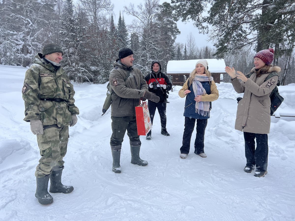 Главной миссией мероприятия от программы «Больше, чем путешествие» было поздравление с наступающим новым, 2026 годом и вручение памятного подарка сотрудникам госинспекции. Именно эти люди чаще других сотрудников национального парка по несколько дней находятся в полевых условиях, вдали от дома.