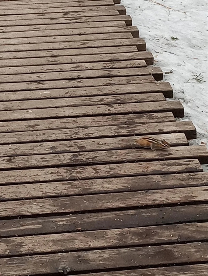 Первая встреча в этом году состоялась на Восточном входе нацпарка. Методист отдела экологического просвещения Надежда Гончарова сделала фото и видео зверька 29 марта во время проведения экскурсии. Бурундук бегал по настилам экотропы вдоль ручья Моховой недалеко от птичьих кормушек.