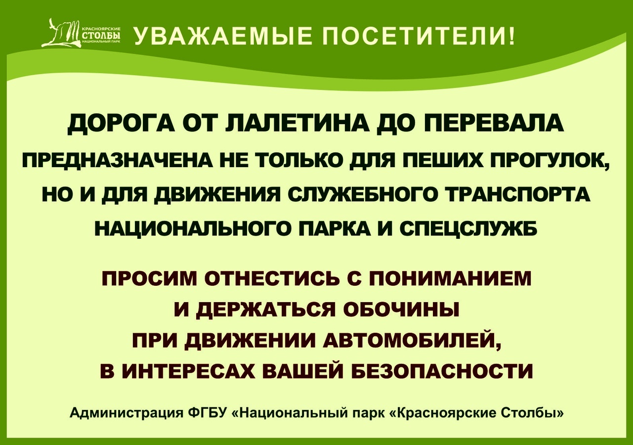 Для вашей безопасности, просим во время движения автомобилей держаться обочины, уступать место служебному и спецтранспорту, не оставлять детей без присмотра и не пользоваться на Лалетинской дороге снегокатами, санками, ледянками, во избежание несчастных случаев.
