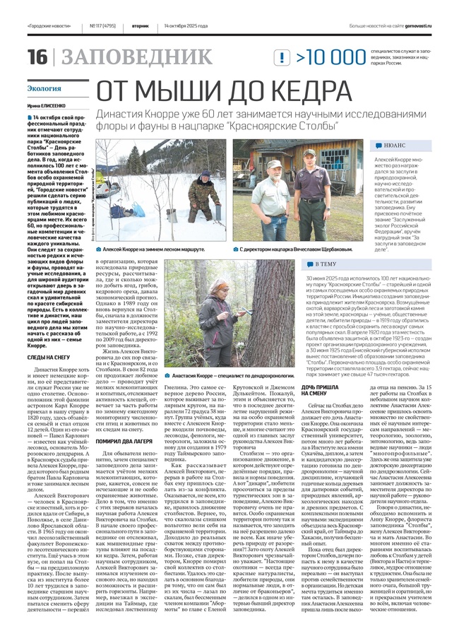 Алексей Викторович многие годы руководил заповедником «Столбы», а сейчас его дочь Анастасия Алексеевна в качестве заместителя директора по науке продолжает дело родителей.