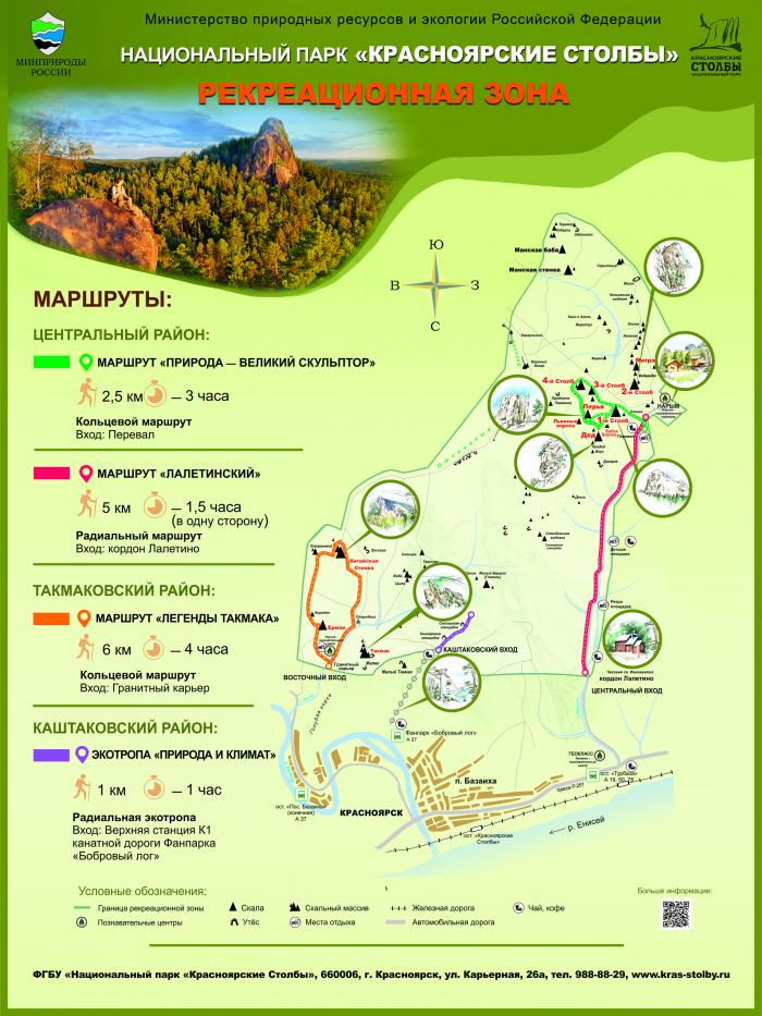 Информируем, что на территории национального парка «Красноярские Столбы» на сегодняшний день прошли соответствующую экспертизу и допущены к посещению только три туристских маршрута и четыре экологические тропы, находящиеся в рекреационной зоне нацпарка: